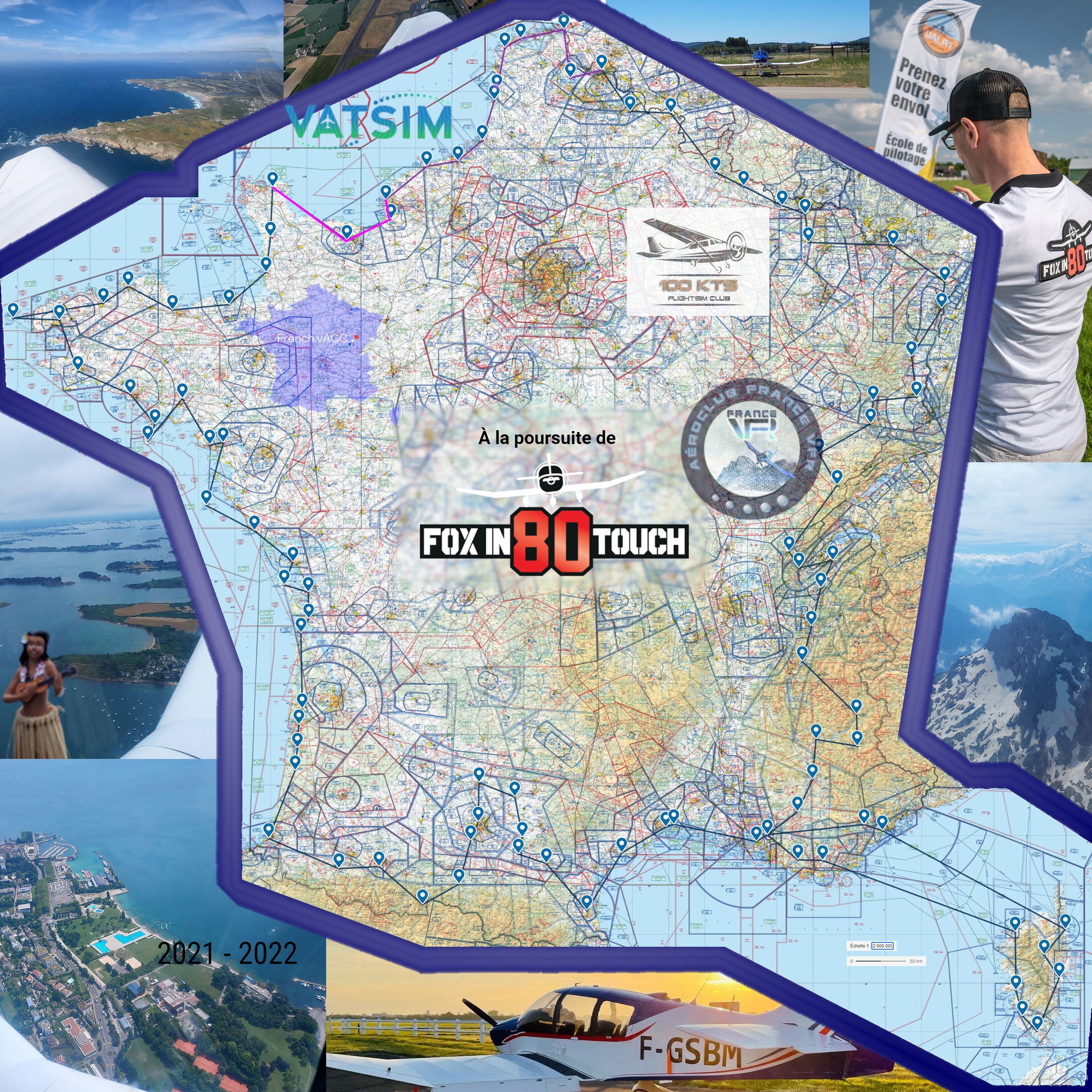 Ces étapes sont calquées sur le périple de Guillaume, pilote à LFQO, qui a réalisé le tour de France en juin 2021 : 41h de vol en solo à bord d'un DR400 à la découverte d'au moins 80 aérodromes et à la rencontre d'autres pilotes et passionés. |