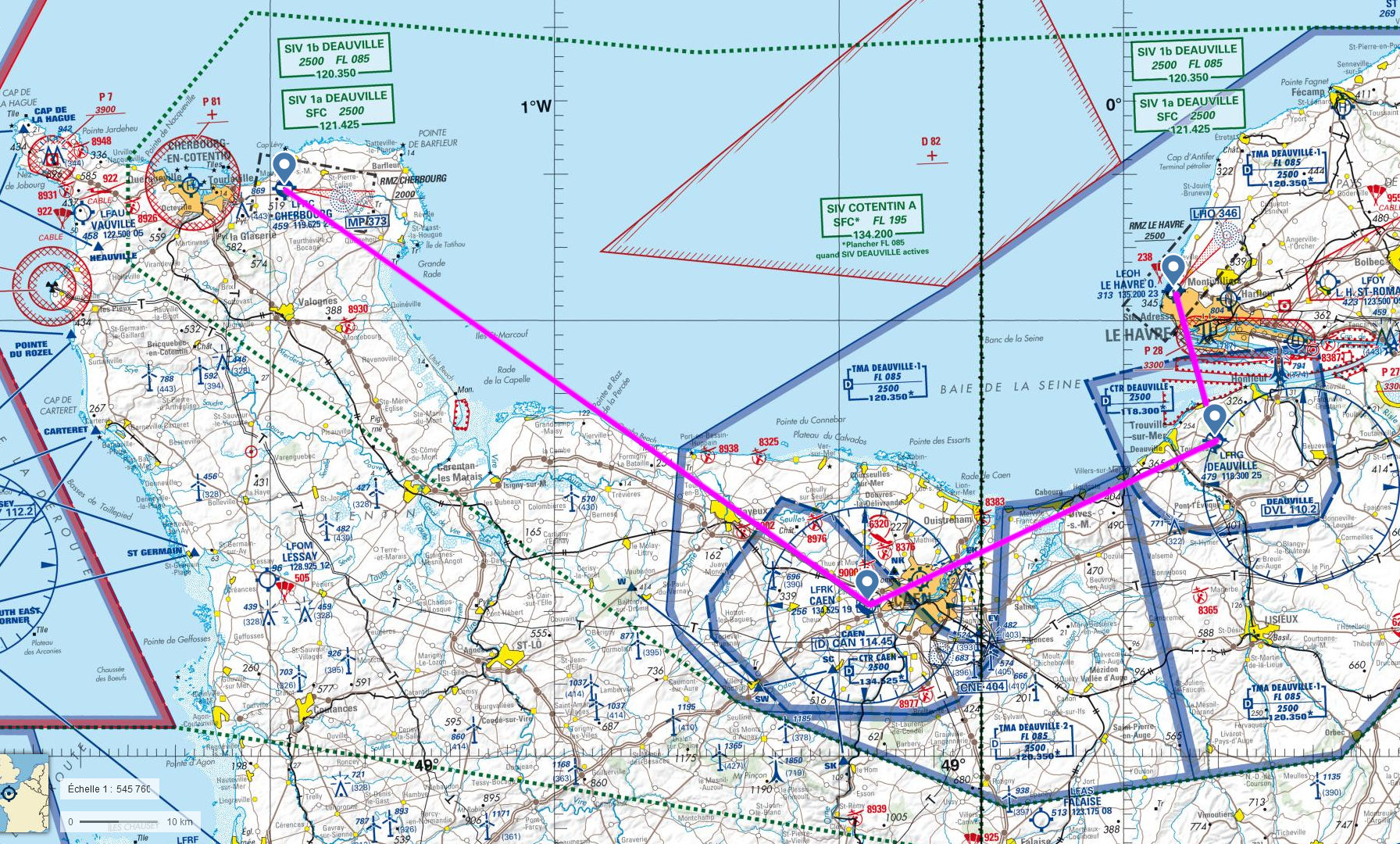 Cette troisième étape nous emmène en Basse-Normandie jusqu'en Cotentin. Elle ne comporte que trois aérodromes après le départ, mais ce sont des terrain d'importance moyenne avec le longue piste en dur. Alors soignez vos intégrations en maximisant la préparation. Étudiez bien les quelques zones à éviter et faites un joli cheminement le long de la côte. N'oubliez pas que les VOR / DME sont d'excellents moyens de navigation plus amusant à utiliser qu'un vulgaire GPS (qui sont très efficaces néanmoins).
