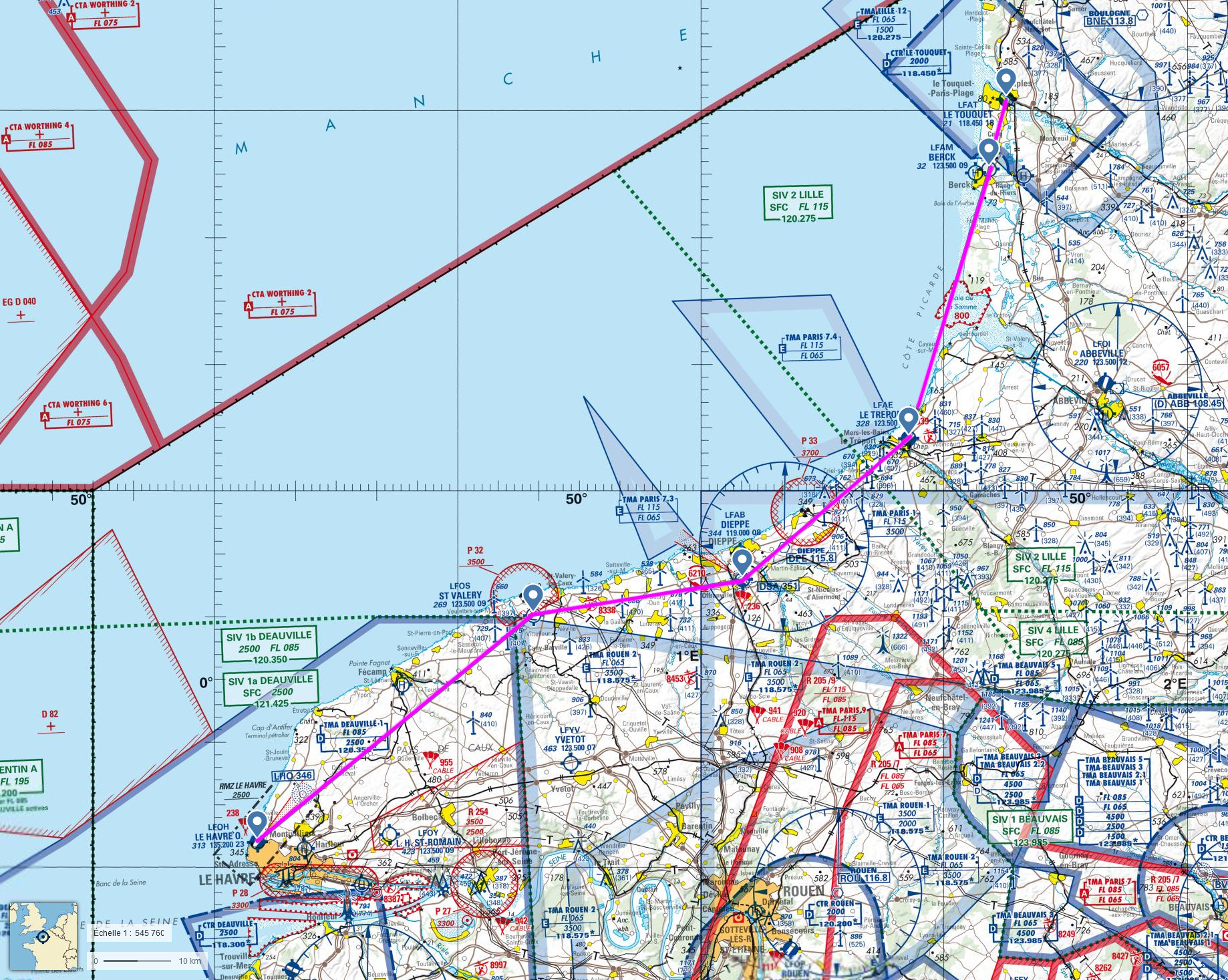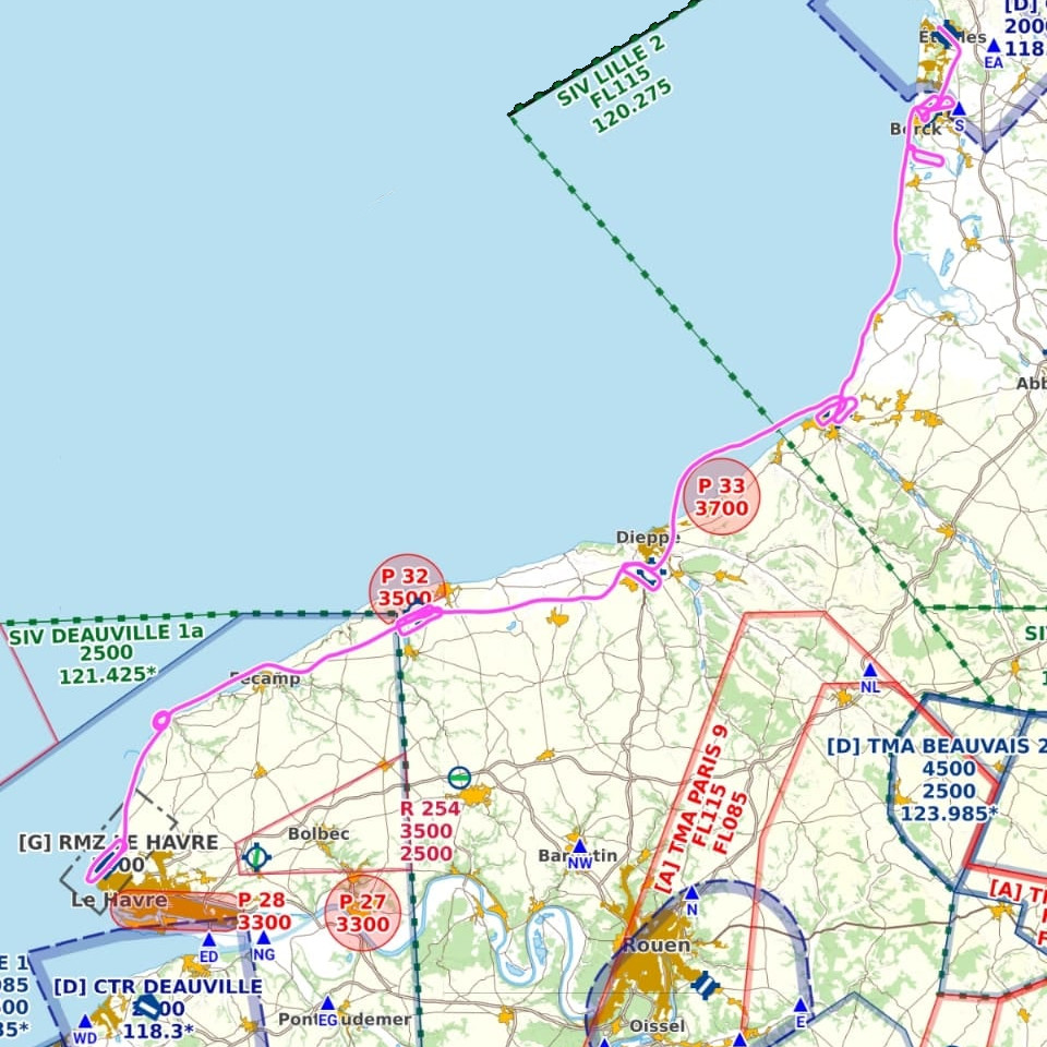 Nous allons suivre la Côte d'Opale, traverser la Baie de Somme et survoler les stations balnéaires Normandes jusqu'au Havre, lieux incontournable de la navigation mondiale...